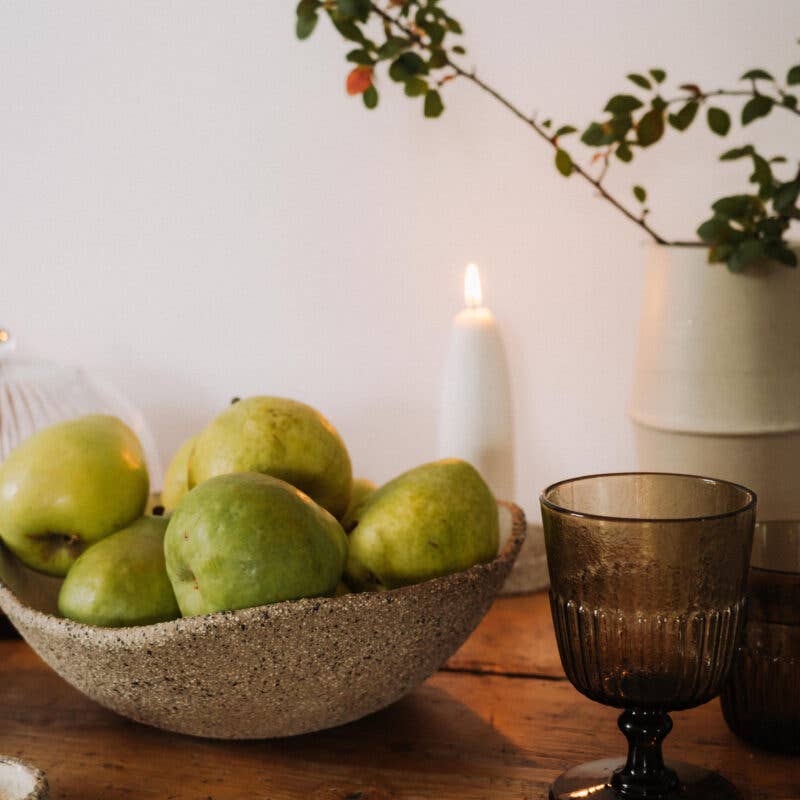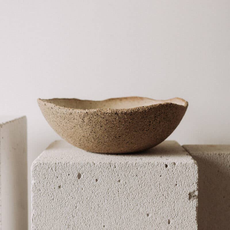 Handmade bowl made of beige terrazzo (rough stoneware). Organic, irregular shape. Color: white-beige with brown effects. Being an effect glaze, each product is unique and the color of the glaze may differ from one product to another. Can be used in the dishwasher and microwave oven Dimensions: diameter 26 cm, height 8 cm Note: Being handmade products, dimensions may differ slightly from one product to another.
