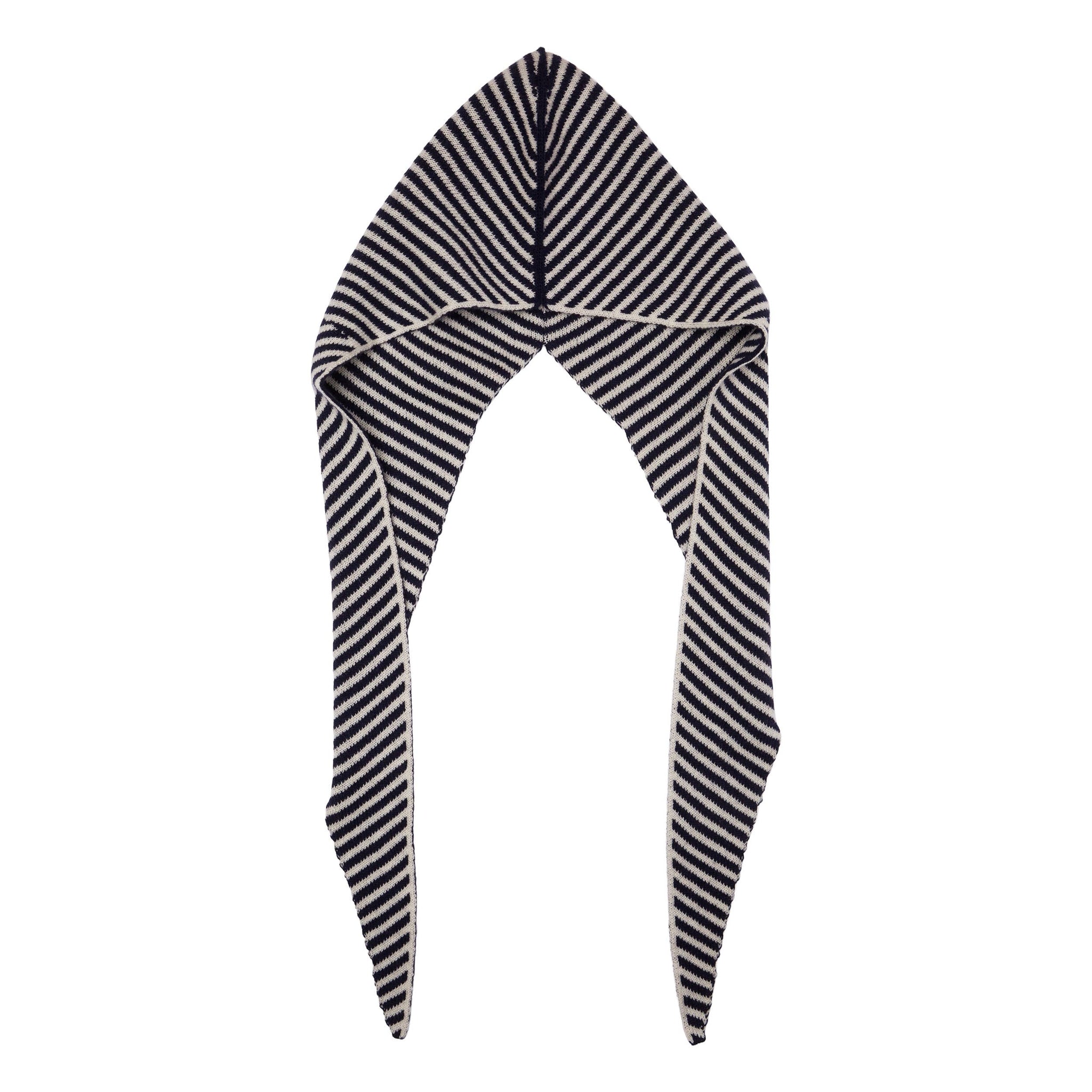 Cute cashmere hood with long tie. 100% cashmere Navy & White Stripe
