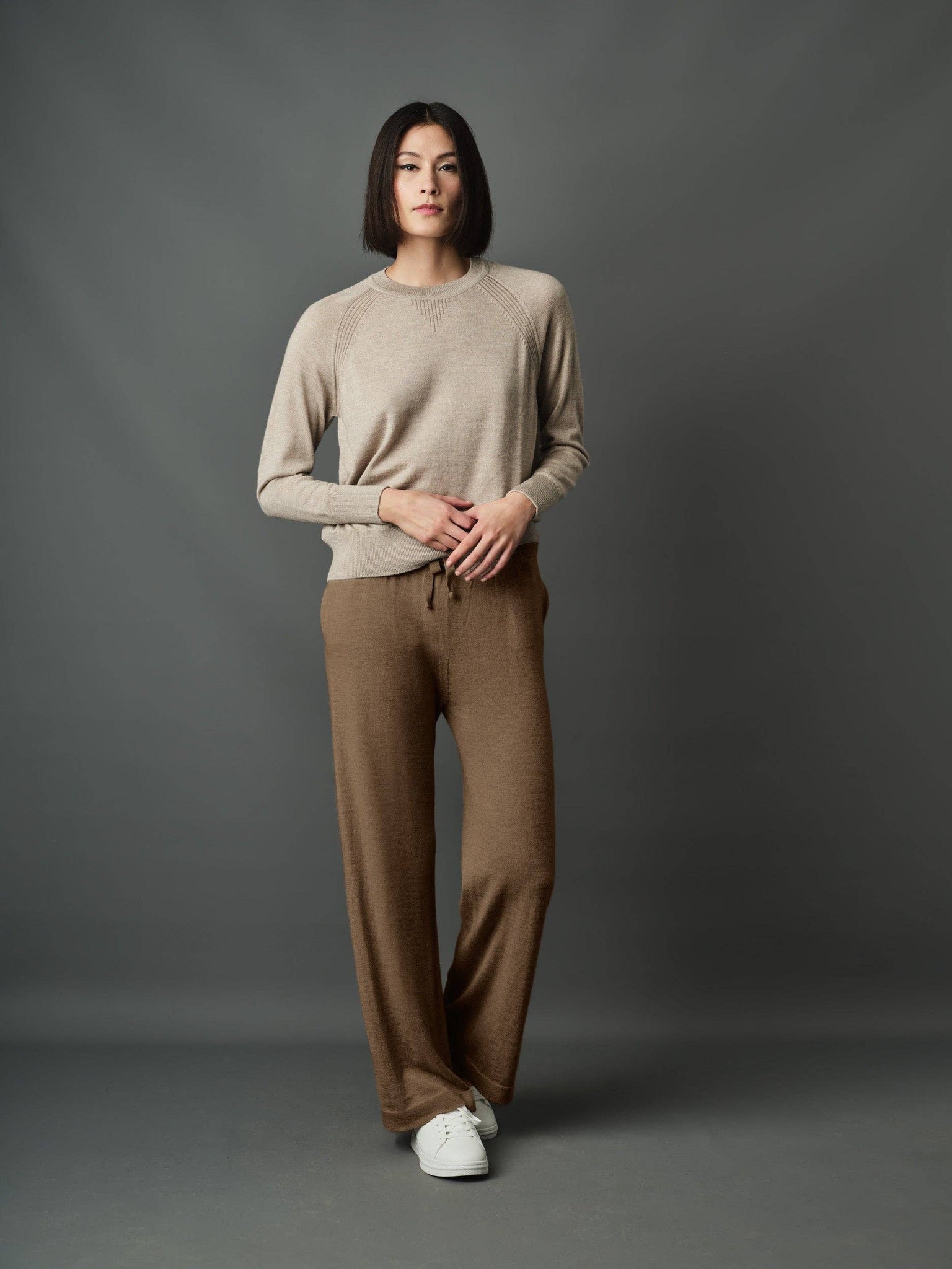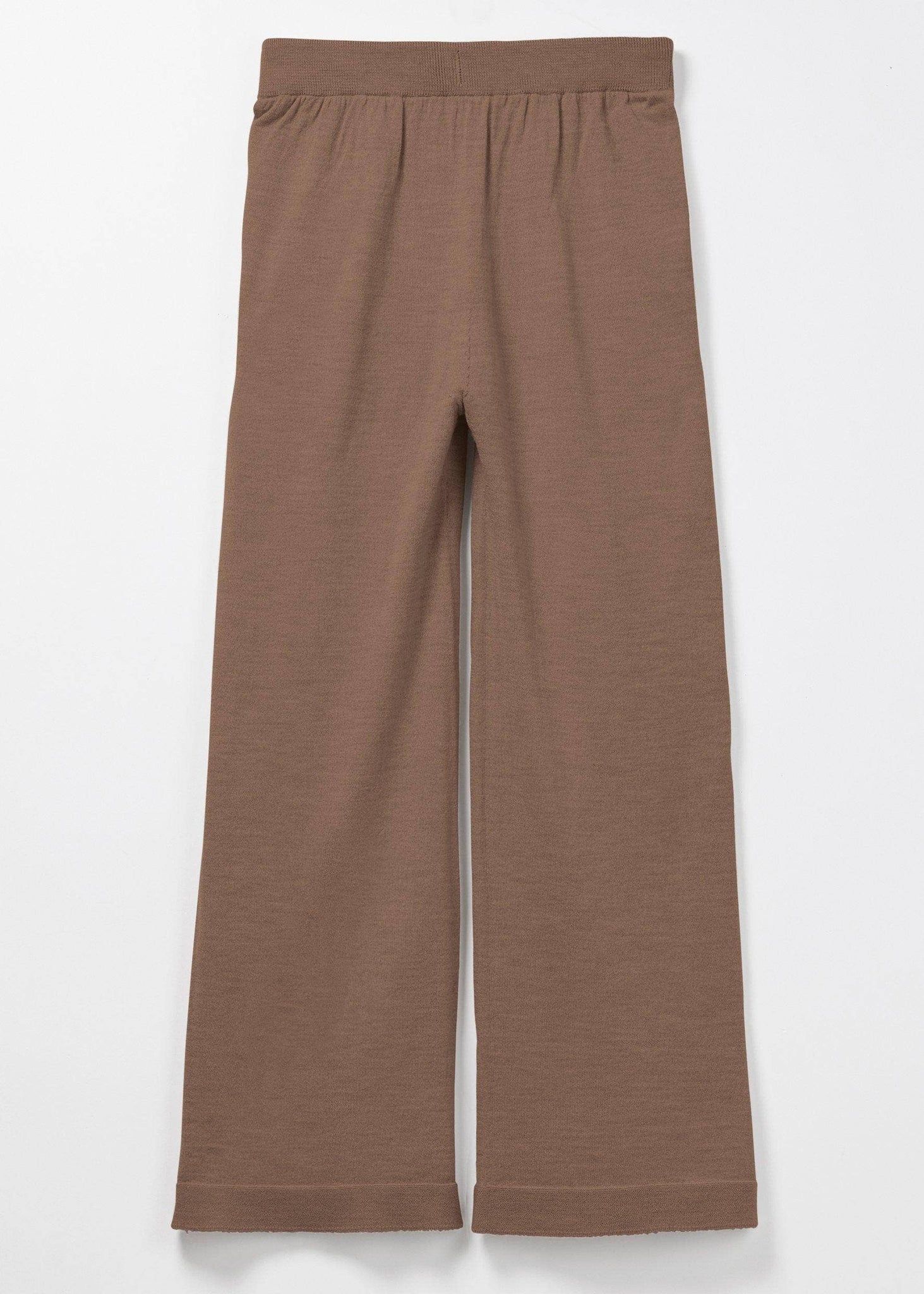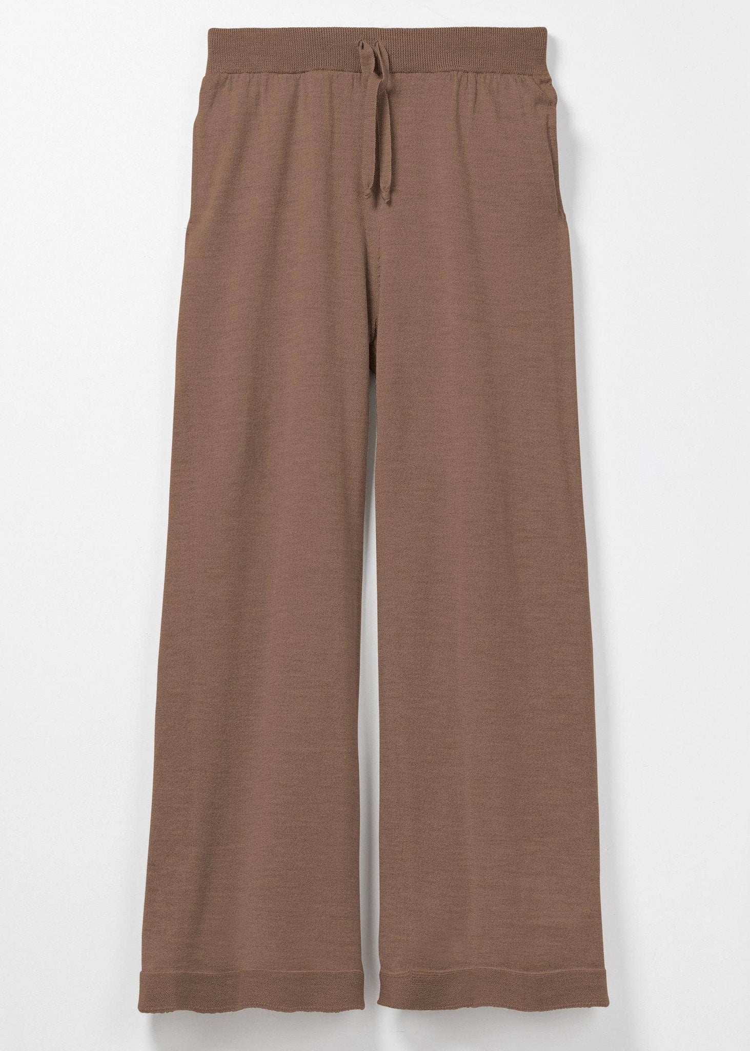 Pebble (Brown) Your essential wide leg pant for everyday wear. Merino drawstring waistband, merino pockets and pearl hem finish. Also comes with the signature yellow intarsia tab on back waistband. Composition: 100% extra fine non mulesed merino wool Model is a size 8, 5'9" tall and wearing a size 1 (S)