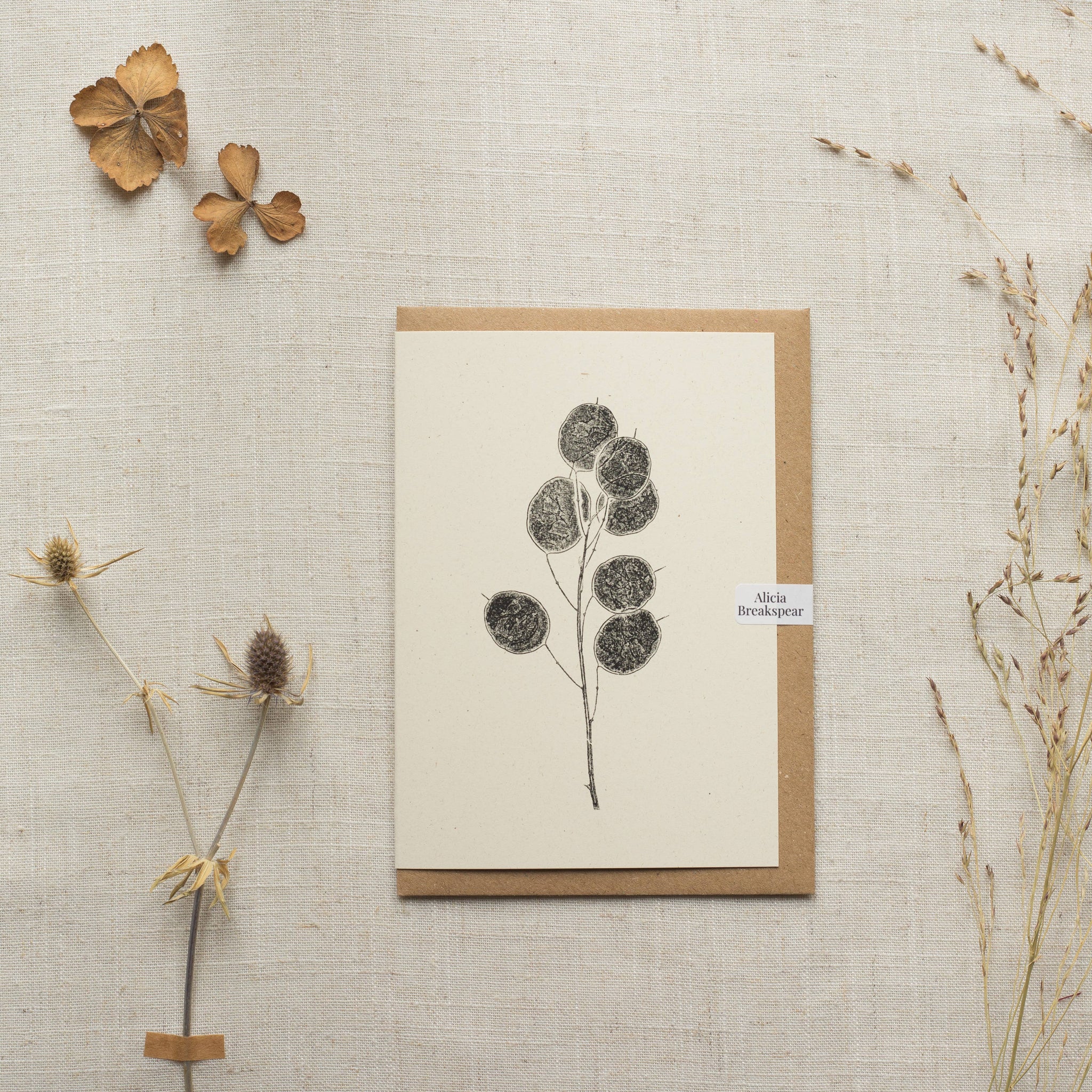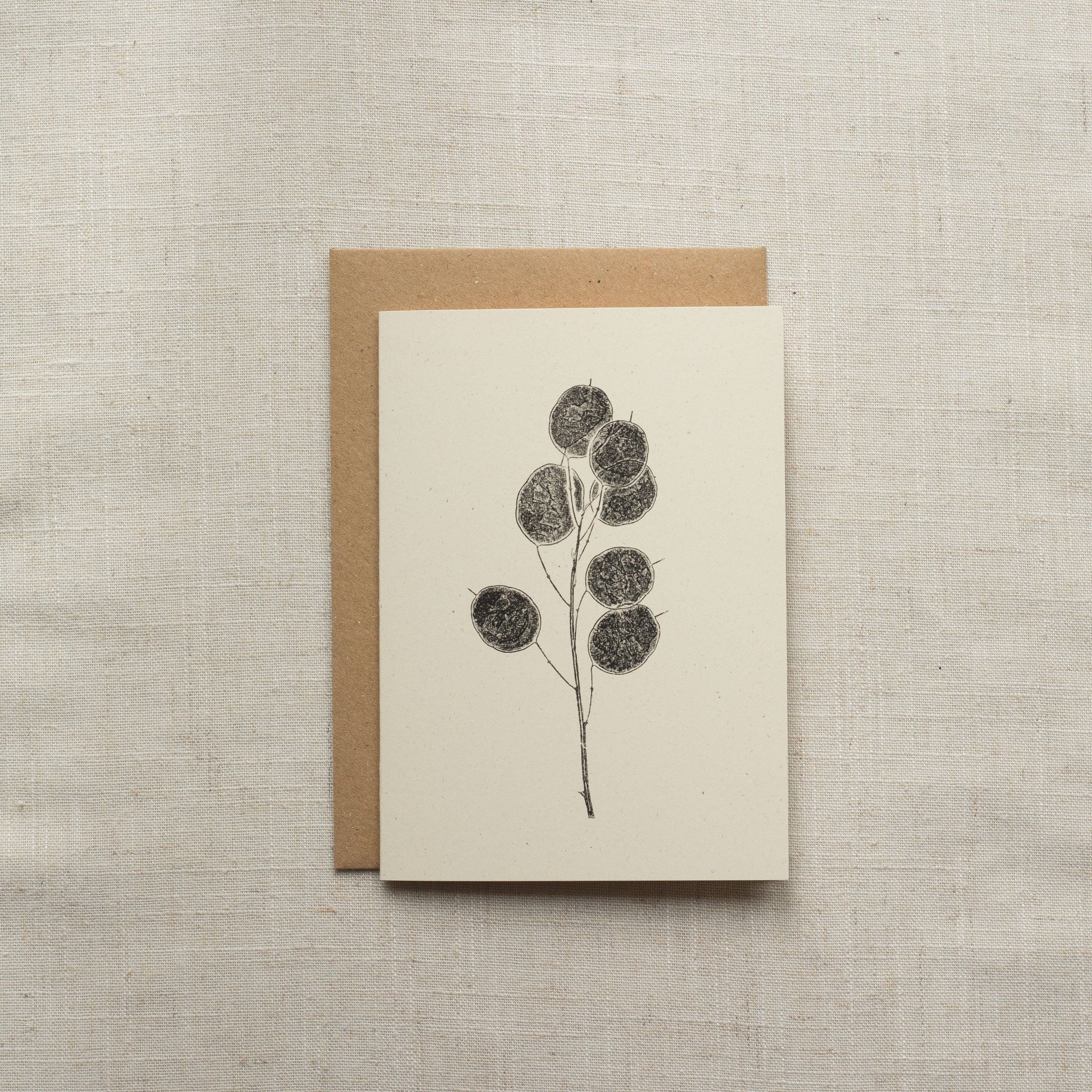 An elegant and timeless greeting card featuring one of the iconic garden classics, Honesty Pods! Created by Alicia's unique process of printmaking with plants.