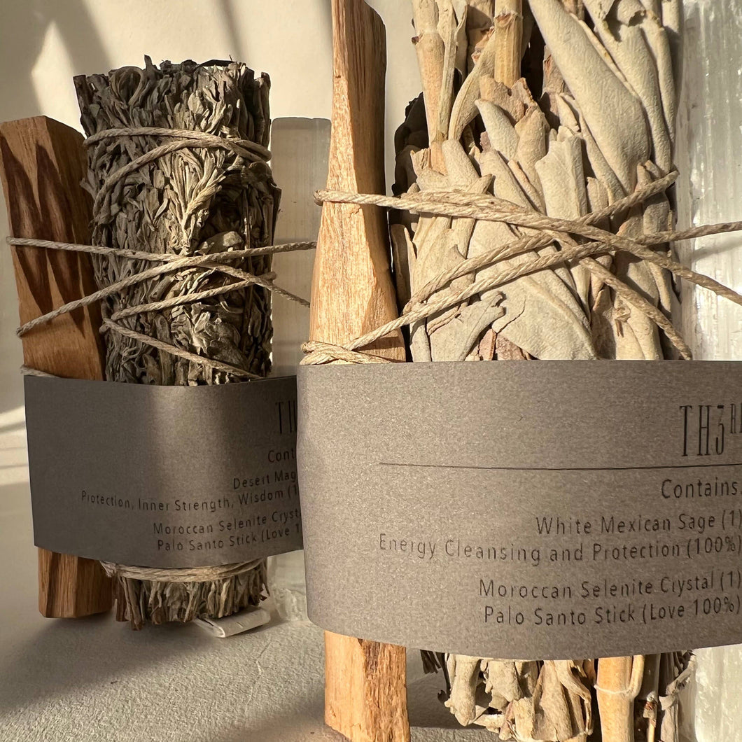 The perfect bundle to cleanse your environment/space. Palo Santo can be used for an everyday light cleanse, keeping your environment full of positive and loving energies. Desert Magic is a protective Sage, it encourages our spiritual development and awareness. Perfect for those looking to enhance their spiritual journey. Selenite is a powerful Crystal, its vibrations are so high that it is self-cleansing and can be used to cleanse other Crystals within its space. Included: Desert Sage, Palo Santo, Selenite Crystal.
