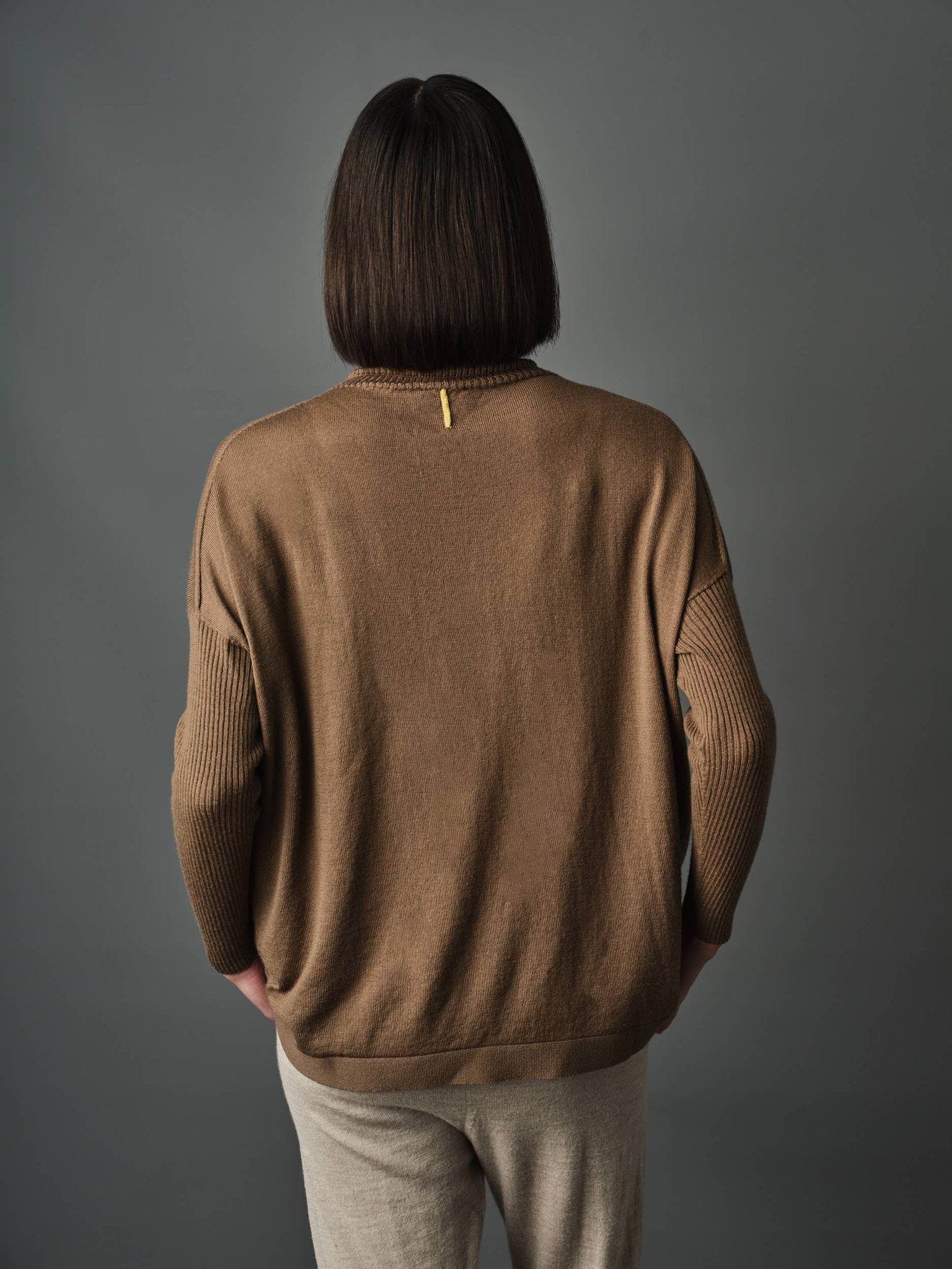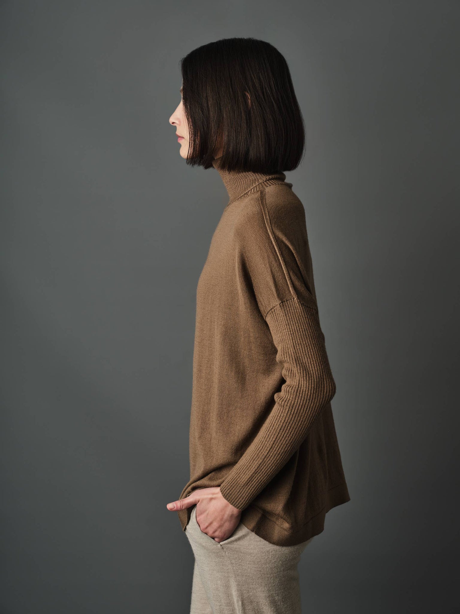 Pebble (Brown) oversized polo neck knit is a dream for your wardrobe. We have added half-sleeve ribbing for a slimmer arm silhouette and detailed shoulder seam for design. The neckline detail and signature yellow intarsia tab on the back neck makes this piece unique. Pearl hem finish. Composition: 100% extra fine non mulesed merino wool Model is a size 8, 5'9" tall and wearing a size 1 (S)