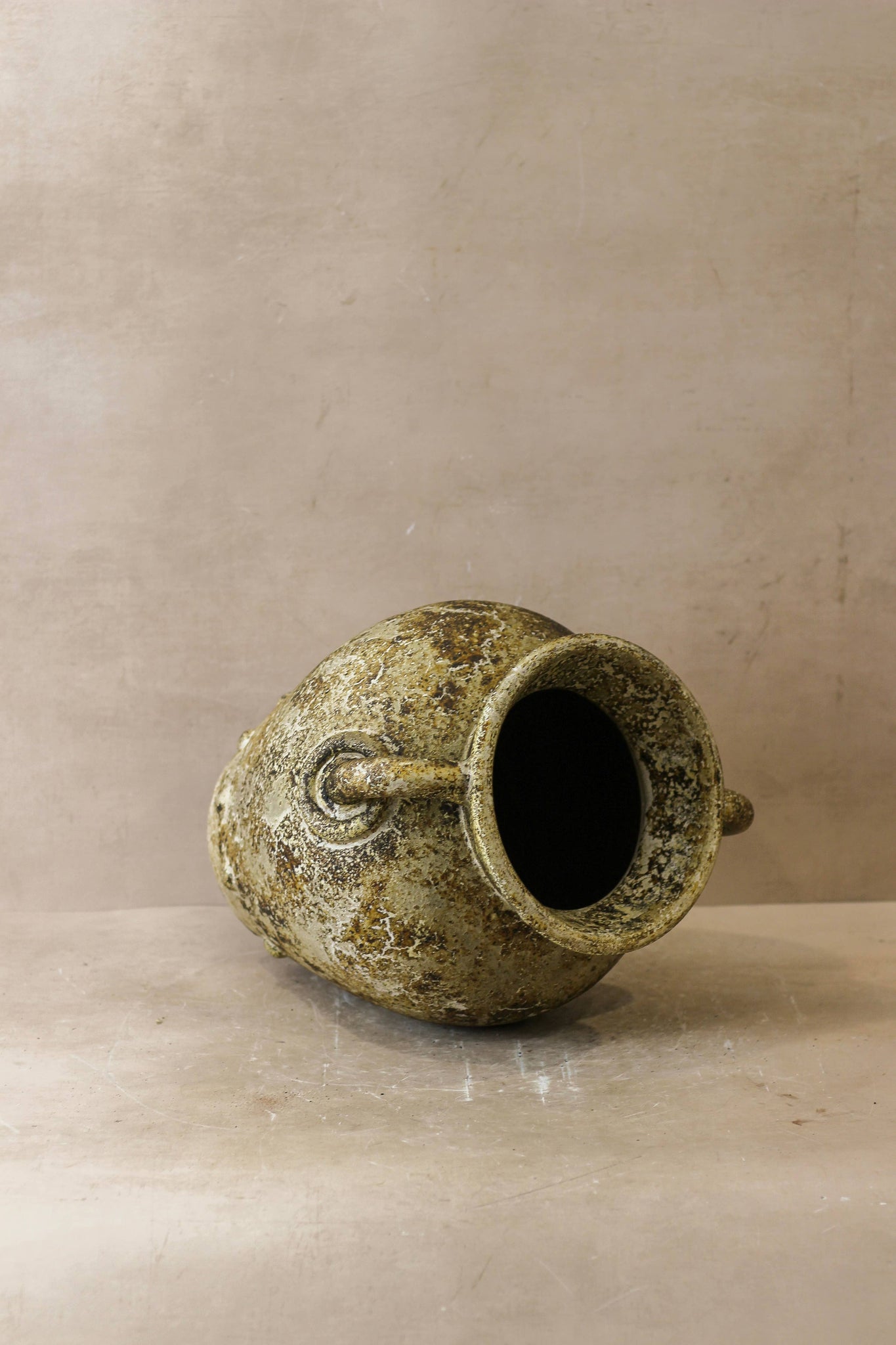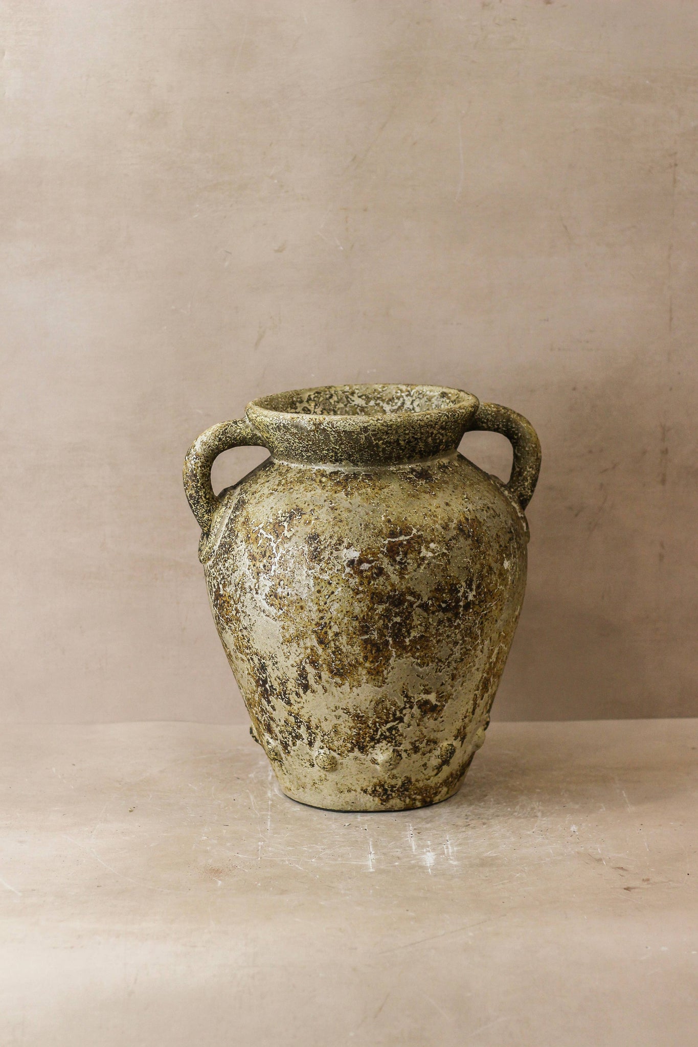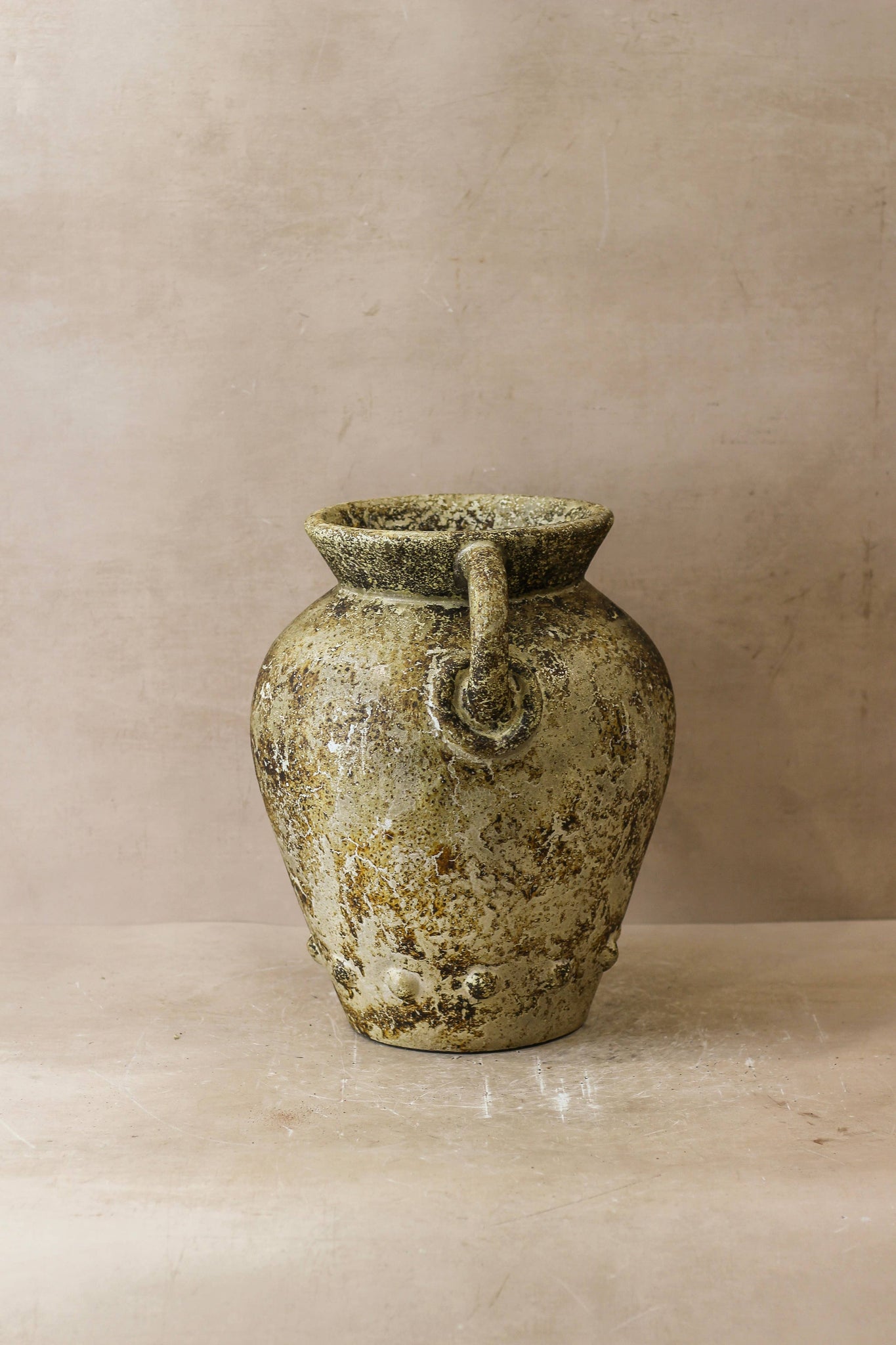 This exquisite decorative piece is crafted from high-quality clay, offering both durability and strength, while featuring a delicate antiqued rustic finish. Each artisan pot is truly one-of-a-kind, as the distinct firing process in traditional brick kilns results in unique and unpredictable variations in the finish, ensuring no two pieces are ever the same. Size: 35cm Diameter x 42cm H Opening Diameter: 16cm